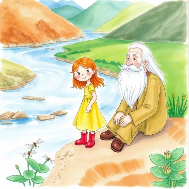 Cada tarde, Mara se sentaba con su abuelo junto a un gran río que cruzaba el valle. El agua corría y decía “shhh-shhh”, como si contara secretos antiguos. Una noche, el murmullo cambió y sonó preocupado: “piedra grande… paso cerrado… pueblo en peligro”.